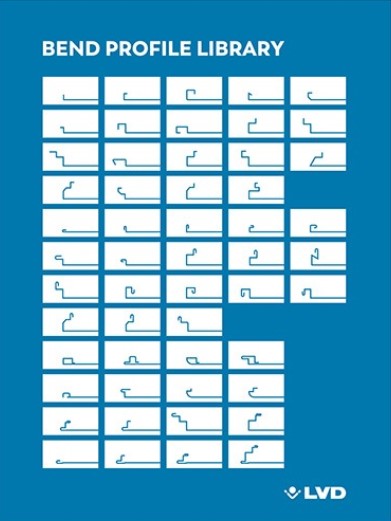 With a universal set of servo-operated up-and-down folding blades, LVD panel benders can process a wide range of profiles and various types of bends. The majority of the profiles can be bent with just one set of universal bending tools. Bends include : positive and negative bends, open and closed hemming, up and down hemming, offset bends, radius bends and closed bends.