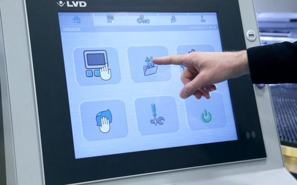 A programmable parts removal chute efficiently offloads parts up to 500 x 525 mm. Parts are separated from the sheet into a parts bin directly under the machine table or to an optional bin-sort system. - LVD Touch-P control