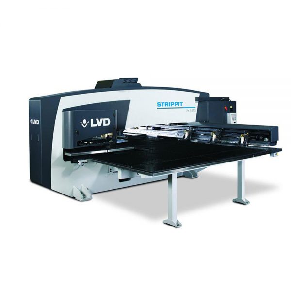 Twenty tool stations accept tools up to 90 mm and are indexable a full 360 degrees for added tooling capacity and reduced setup. Use multitools to house up to 200 tools. Strippit PX is T-style tooling compatible. - Single punch head system