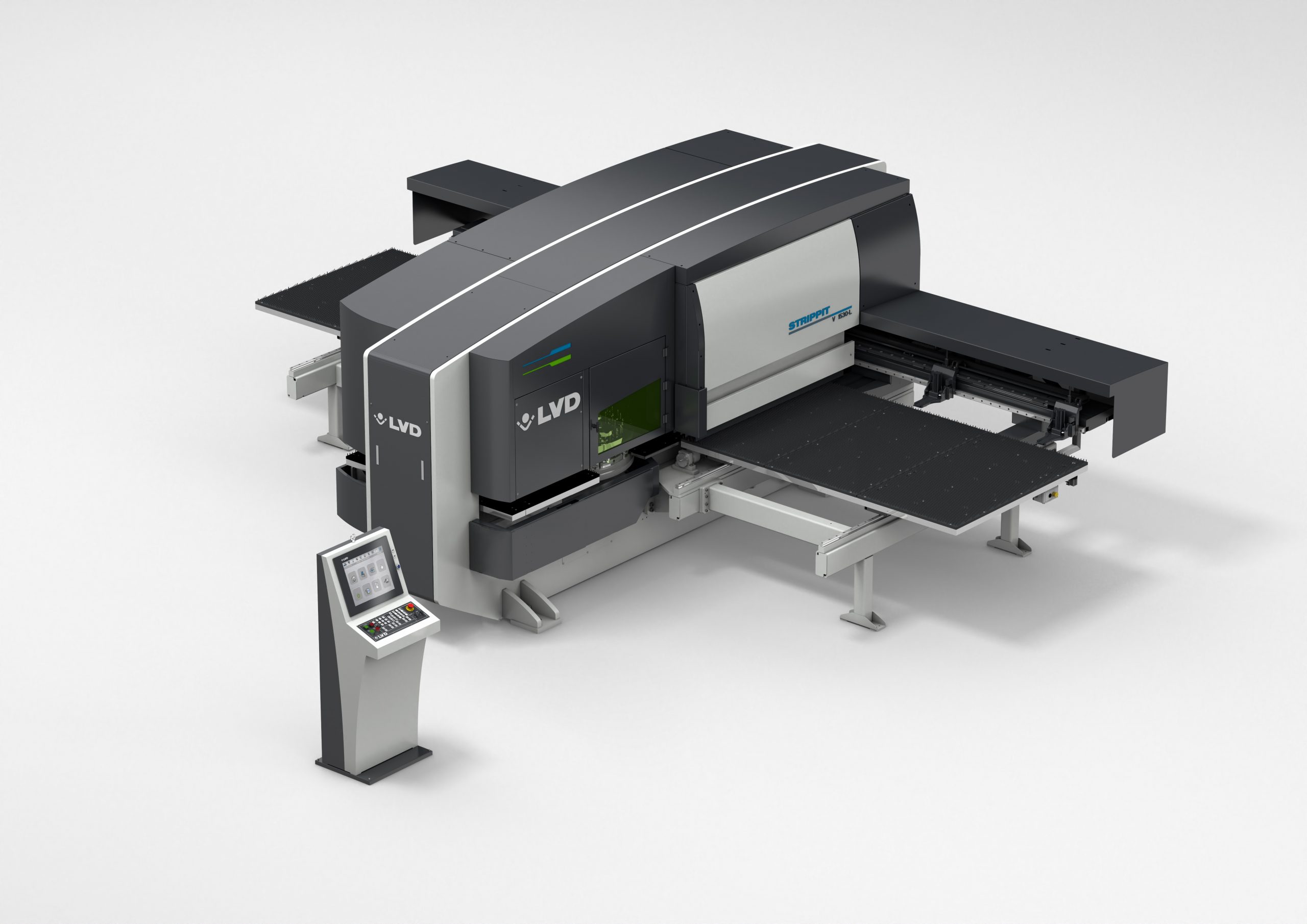 The Strippit V is a high-speed 30 ton hydraulic punch press built on a heavy-duty bridge frame for exceptional stability and punching accuracy. - High production capacity