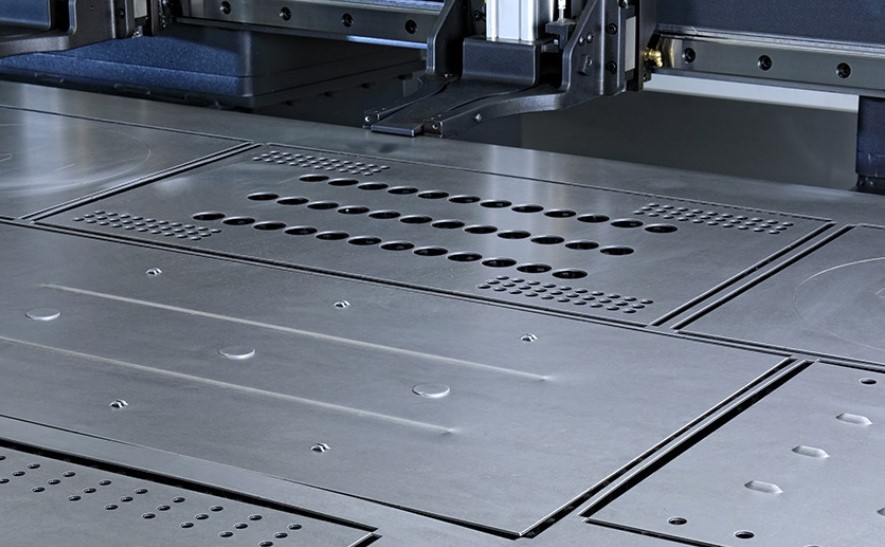 The punch press features 48 thick-turret tooling stations with four 88.9 mm auto-index stations. This versatile mix of stations – able to accept forming, embossing, louvering, wheel and tapping tools – maximises tooling capacity and reduces set-up time for high production capacity. - Sleeved turret